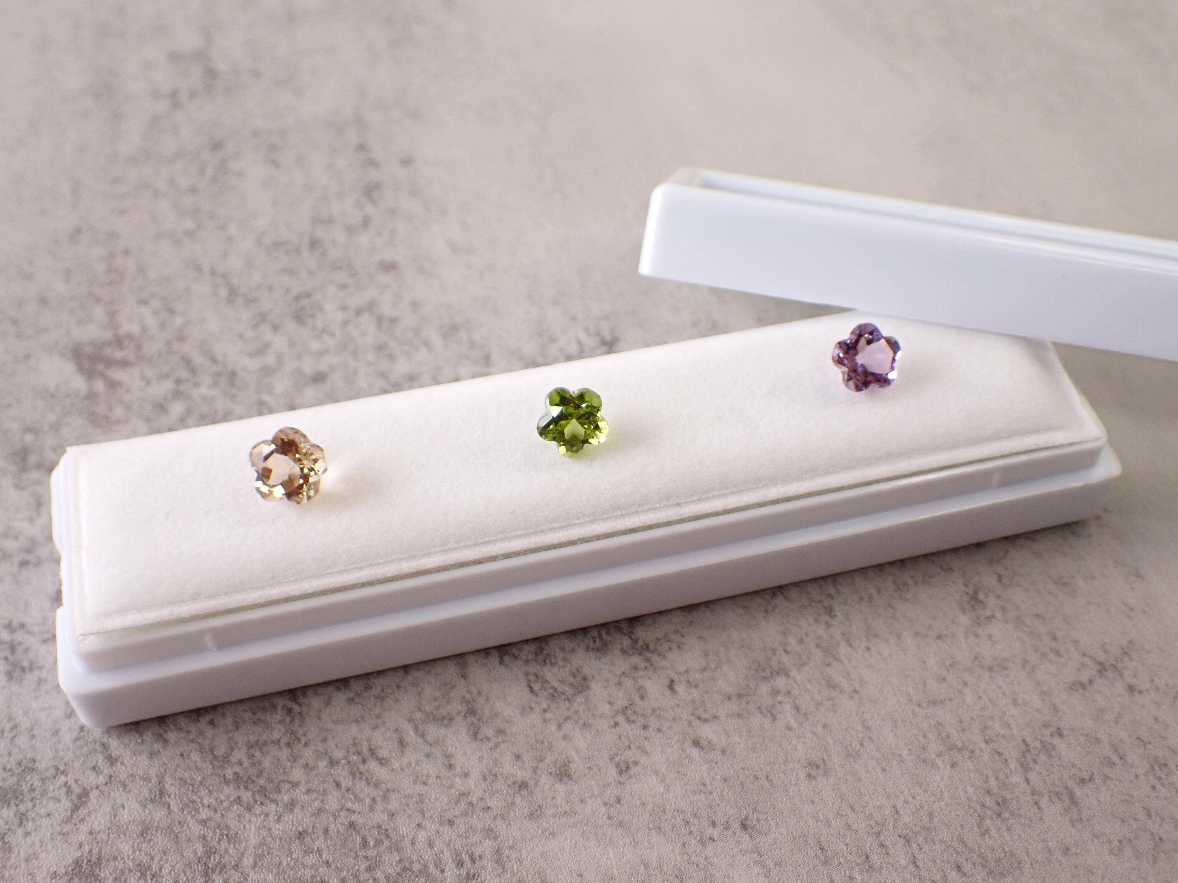 フラワーカットのルース3点セットをロングケースに入れてお届け致します。