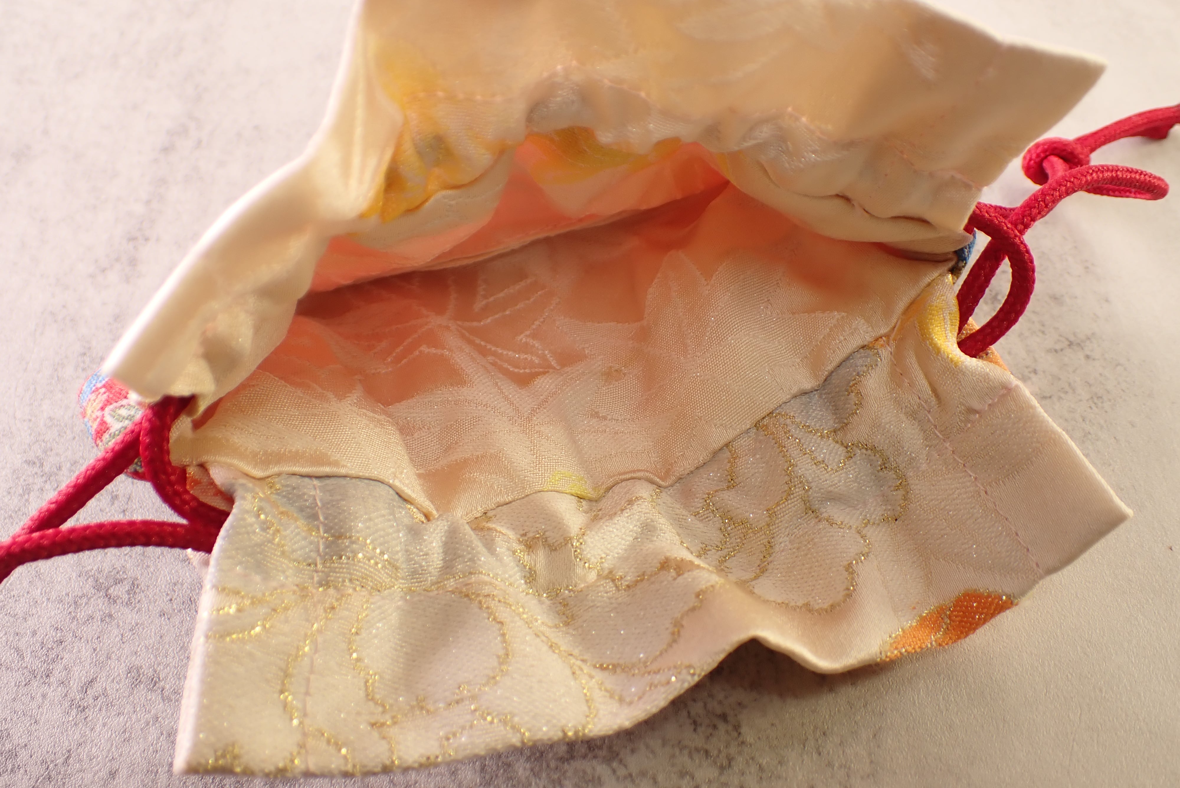 着物を再利用して作られた巾着袋です!